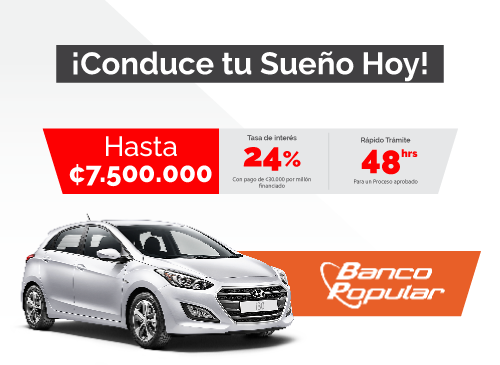 Financiamiento hasta un máximo de ¢7.500.000 para compra de vehículo, manejando una tasa de interés del 24% pagando ¢30.000 por millón financiado. Requisitos: Crédito limpio aportar constancia salarial, orden patronal tanto del deudor como el fiador. Si es empleado del gobierno de piden fiador. El trámite tiene una duración de 48 horas.